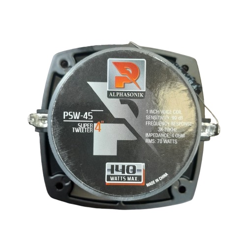 دسته: اسپیکر, سوپر توییتر و هورن برچسب: بیشینه صدای خروجی 80 وات توان خروجی اسمی (RMS) 40 وات حساسیت 101 دسیبل فرکانس پاسخ‌گویی 2500 الی 20000 هرتز امپدانس 4 اهم, سوپرتیوتر آلفاسونیک مدل PSW-45 توان 140 وات برند: ALPHASONIK